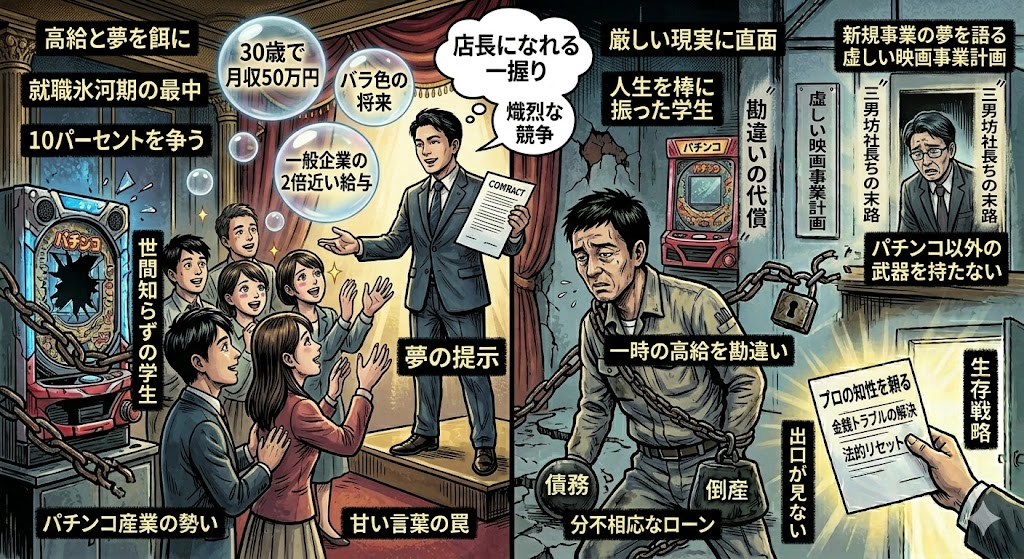 📉 高給と夢を餌に大学生を奪い去ったパチンコ業界の勧誘 2000年代初頭のパチンコ業界は大卒採用を本格化させていました。就職氷河期の最中、彼らは若者に夢のような条件を提示し続けました。30歳で月収50万円という一般企業の2倍近い給与を約束したのです... -