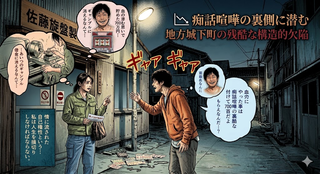 📉 痴話喧嘩の裏側に潜む地方城下町の残酷な構造的欠陥 職場の入り口で「貸した30万を返せ」と揉めているカップルは、単なる痴話喧嘩ではなく、この街に潜む残酷な格差の象徴です。真実を言えば、工場で実直に旋盤を回して700万円を貯めた女性と、ギャンブ... -