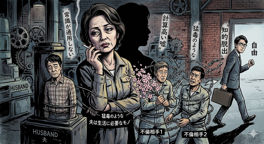 📉 普通の常識が通用しない猛毒のような女性の出現 下請け工場の現場には時として普通の常識が全く通用しない猛毒のような人物が潜んでいます。50代で子育ても終えたある女性は旦那がいながら二人の男を手玉に取る三重生活を送っていました。彼女の日常は計... -