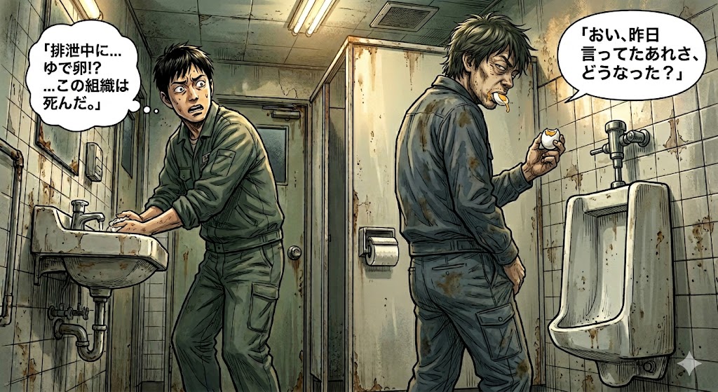 📉 排泄中にゆで卵を食う男が象徴する組織倫理の死滅と末期症状 30年のデフレは中小企業の倫理観や精神性を根底から腐らせました。信じられないと思いますが、男女共用トイレで男女の従業員が一緒に用を足す職場が存在します。しかも用を足しながら男女で世...