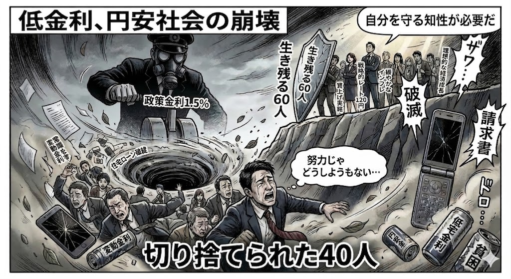 政府は、この10年死守してきた円安誘導を、ついにゴミ箱に捨てます。加速するスタグフレーションを止めるために、金利を1.5%程度まで引き上げ、円レートを強引に「120円」に固定する戦略に出るでしょう。これが何を意味するか? 低金利という「延命装置」で生き延びてきた中小企業や、変動金利という「時限爆弾」を抱えた住宅ローン世帯が、一斉に爆死するということです。