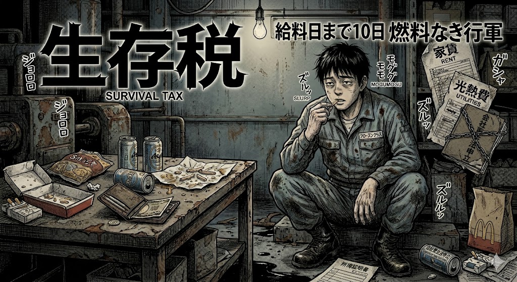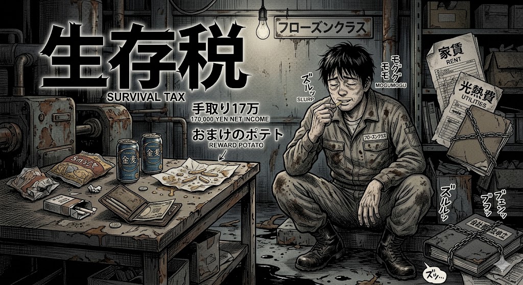 5年前の下請け工場で目撃した光景は日本の絶望を先取りしていました。30歳目前の男性社員は自分の分を買う金さえ財布に残っていませんでした。私と同僚の「おまけ」であるポテトを彼は嬉しそうに頬張ったのです。手取り17万で地方の独身は限界という現実はあまりに過酷と言えます。家賃や光熱費が追い打ちをかければ最低限の金すら残りません。これが現場の若者が直面している生存税という名の搾取なのです。