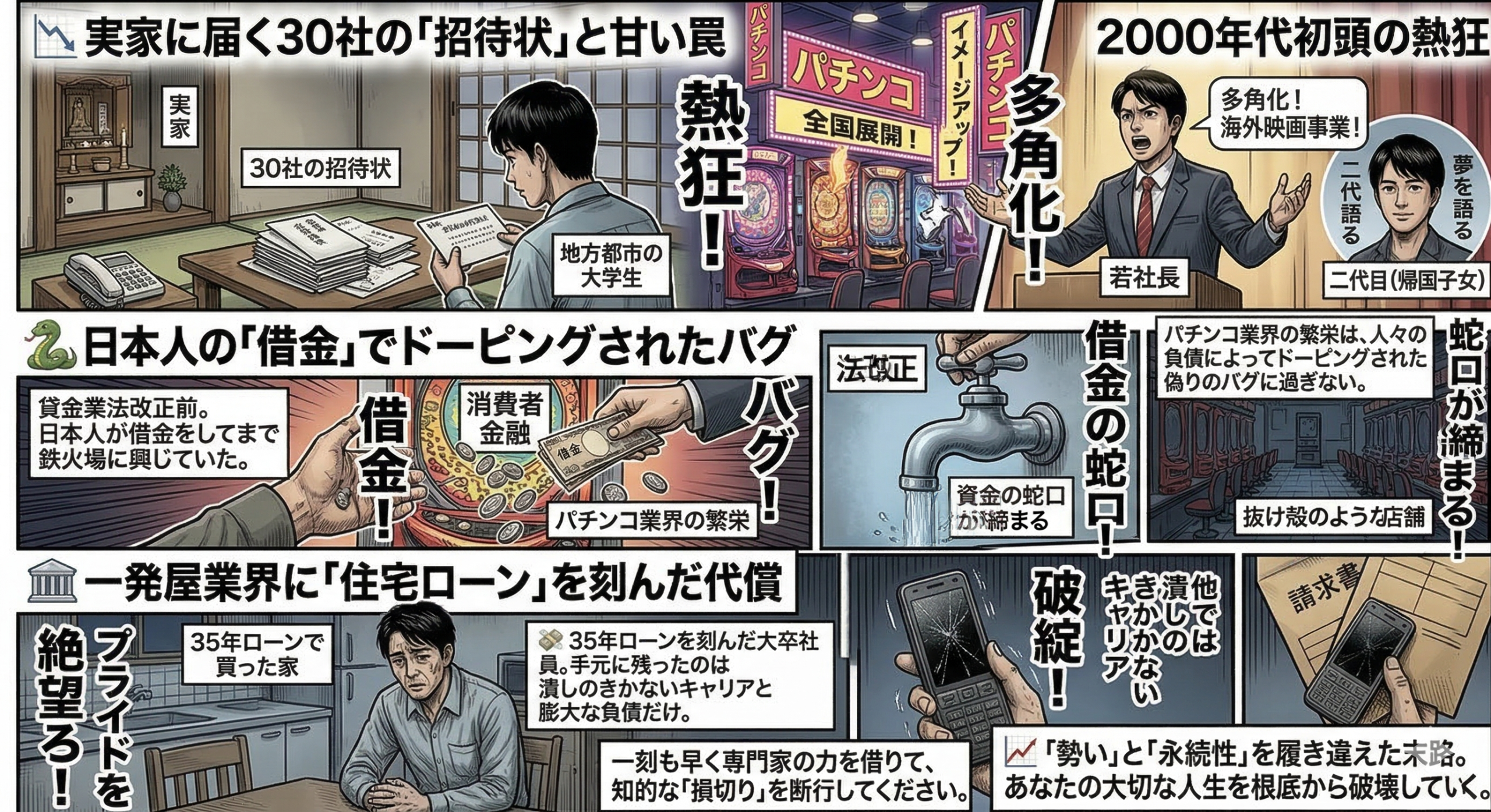 なぜあの時、あれほどの大金が業界に流れ、学生たちを惑わすことができたのか。理由は明白であり、当時は貸金業法が改正される前、消費者金融が街に溢れ日本人が借金をしてまで鉄火場に興じていたからです。パチンコ業界の繁栄は、人々の負債によってドーピングされた偽りのバグに過ぎません。法改正で資金の蛇口が締まれば、後に残されたのは抜け殻のような店舗と行き場を失った社員たちだけでした。