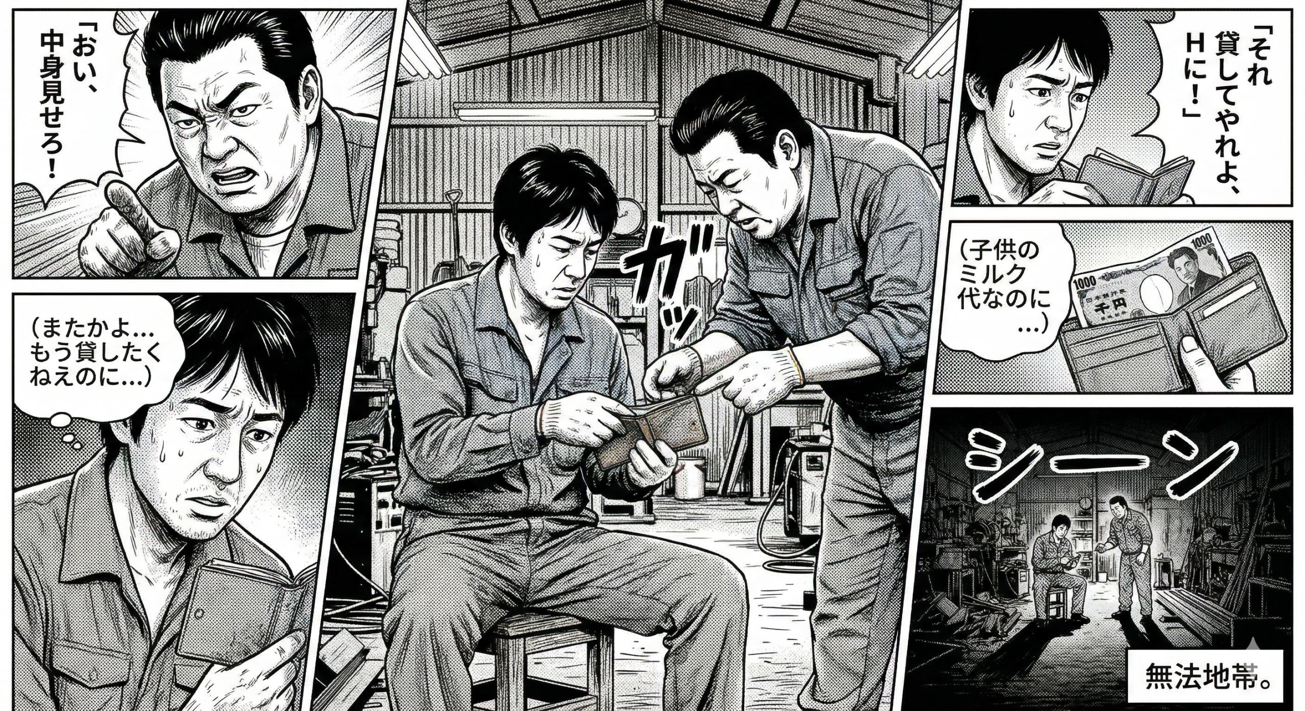 仕事中に突然同僚から財布の中身を検閲される光景を想像してください。普通の社会なら即座に警察沙汰ですが、採用面接すら機能していない2次下請けの現場ではこれが日常です。「その金をあいつ(H)に貸してやれ」という命令が、工場の片隅で強制的な金の移動としてまかり通る。善意のカケラもない身内同士の獲物指名であり、搾取の仕組みが稼働した瞬間でした。